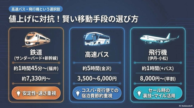 新幹線と在来線特急の乗り継ぎ料金が値上がりしたことで、高速バスや飛行機を検討する方も増えています。大阪〜金沢間の高速バスは片道3,500〜5,000円程度と鉄道の半額以下。所要時間は約5時間かかりますが、夜行便を利用すれば宿泊費を節約できるメリットもあります。大阪〜富山間も高速バスなら4,000〜6,000円程度です。飛行機については、大阪(伊丹)〜小松空港間のフライトが約1時間で、早期予約であれば8,000円前後で利用可能です。小松空港から金沢駅へはリムジンバスで約40分。トータルの移動時間を考えると新幹線に軍配が上がりますが、セール時期を狙えば料金面では飛行機が有利になることもあります。旅のスタイルや予算に合わせて、最適な移動手段を選んでみてください。